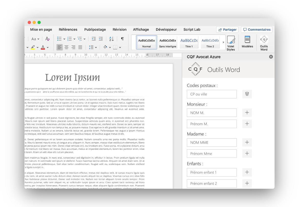 Création d'un complément Office : un panneau latéral avec des outils personnalisés de Microsoft Word pour un cabinet d'avocat.