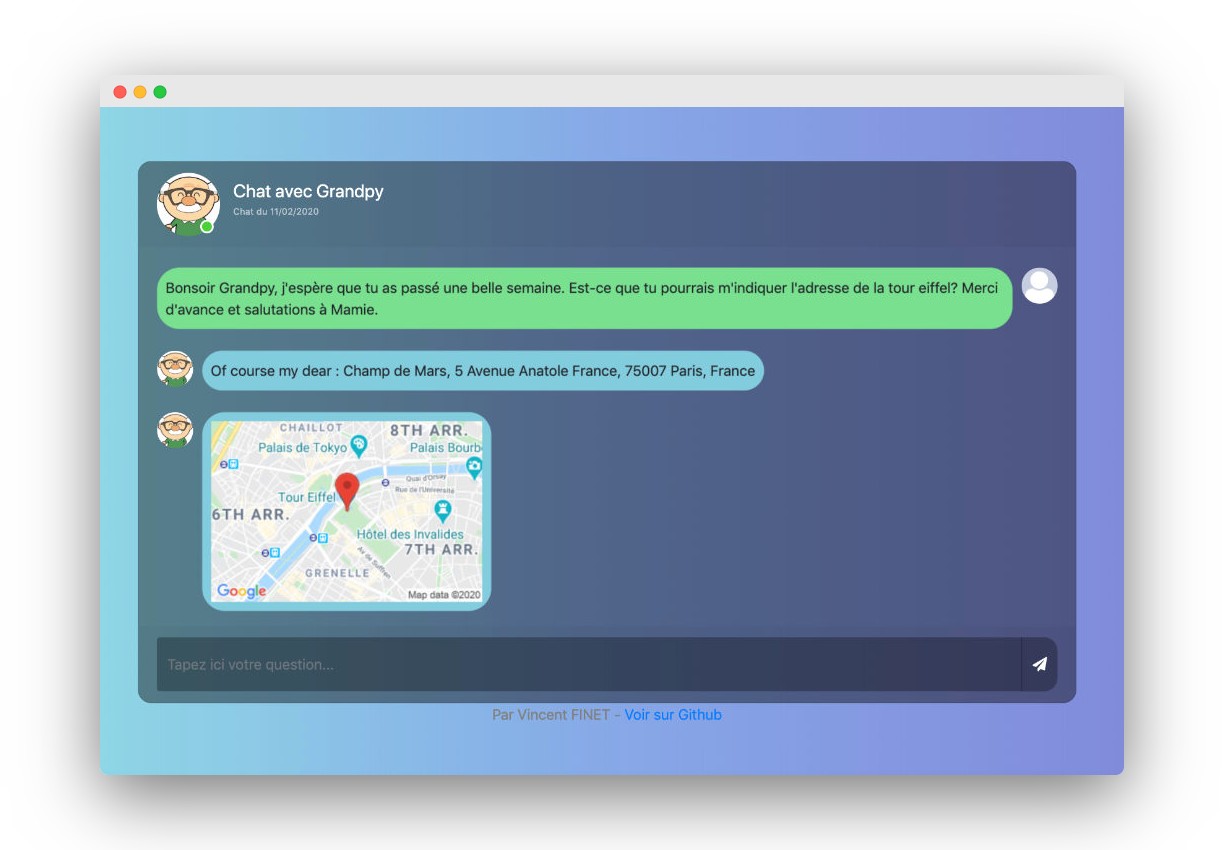 Chat géographique en ligne sous la forme de questions posées à un grand-père : 'Grandpy'. L'application analyse le texte, extrait le lieu et restitue l'adresse, la carte et quelques anecdotes sur un lieu situé à proximité.
