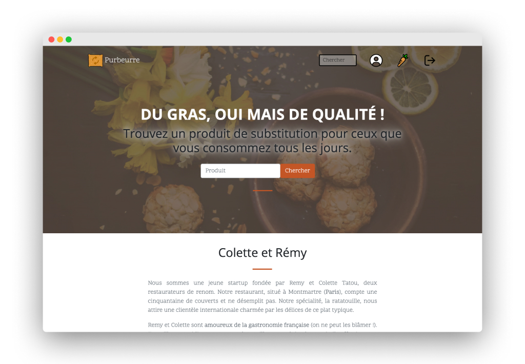Un projet d'étude qui permet de comparer les score nutritionnels d'aliments vendus en France. Le site doit permettre d'enregistrer ses substituts d'aliments favoris dans un compte que l'on peut créer. La charte graphique est imposée.