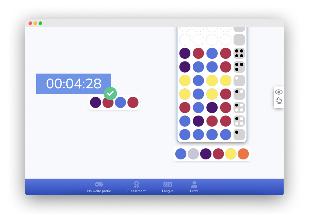 Projet de fin d'étude, ce site s'articule autour du mastermind. Multilingue et avec un classement international, le but du jeu est de trouver en un minimum de coups la combinaison aléatoirement générée. Le déploiement est fait à l'aide de containers Dockers.